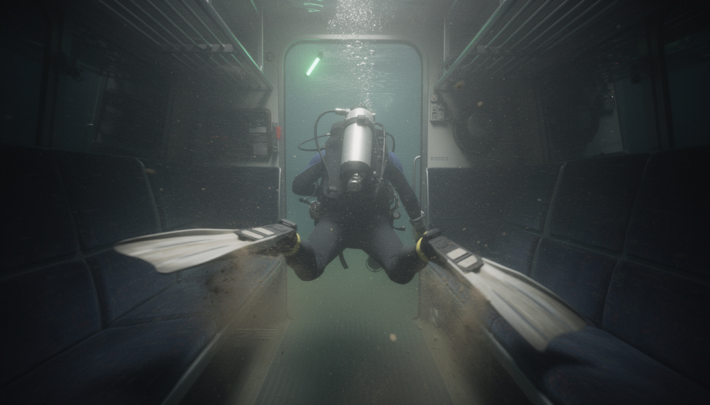 I burst through the exit and into the open water, not stopping to look back at the solitary wagon on the tracks. I followed the steel rails in reverse, my heart hammering a frantic rhythm against my chest. The murky blue of the deep felt like a predator’s mouth closing behind me.